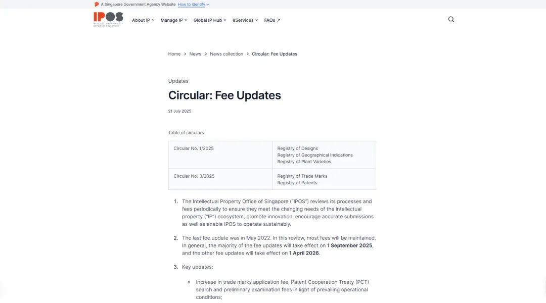 新加坡知识产权局(IPOS)自2025年9月1日起实施新规,将每件专利申请的免费权利要求项数量从20项削减至15项,同时全面上调相关费用。其中,权利要求超项费从40新元(约220元人民币)大幅提高至80新元(约440元人民币),专利续展费也同步上调约7%。 新加坡一律师事务所合伙人