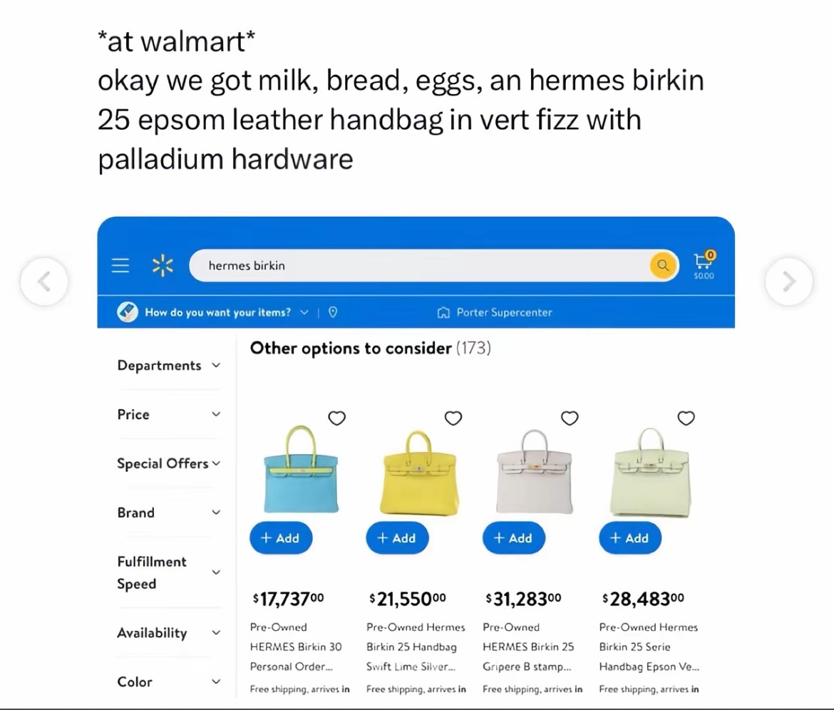 导读 今年初,一款被称为“沃尔玛铂金包”(Walmart Birkin)的手袋在社交媒体爆红。这款售价仅80美元、被戏称为“沃金包”(Wirkin)的产品,外观酷似爱马仕铂金包。爱马仕铂金包是奢侈品界的经典单品,售价通常超过1万美元,平均每只包需要匠人耗费约40小时手工完成。此次撞款风波正
